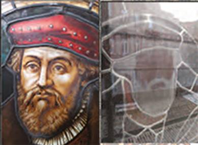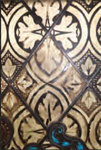 Beispiel für die aufwändige Gestaltung der Fenster: um die erwünschte Farbwirkung zu erreichen, wurde auch die Rückseite des Glasfensters bemalt